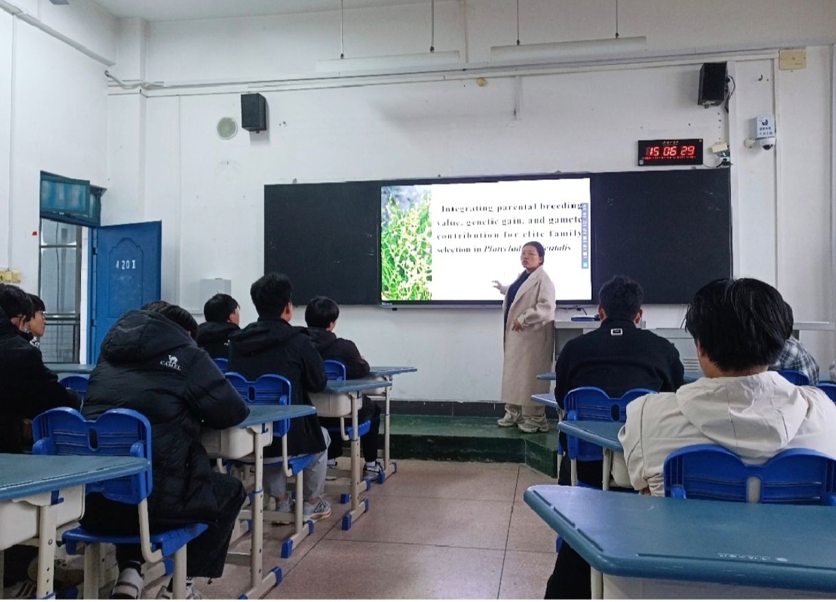 11月06日下午15时,williamhill中文焦思倩博士在4201教室举办学术讲座,报告题目为《Integrating parental breeding value, genetic gain, and gamete contribution for elite family selection in Platycladus orientalis》,我院环境生态工程专业学生聆听了报告。焦思倩博士围绕侧柏种子园的遗传改良与优良家系筛选,从研究背景、关键技术、成果应用等多个维度展开系统讲解。她指出,种子园作为林木良种选育的核心平台,在提升木材产量、改善干形质量、保存稀有基因等方面具有不可替代的作用。但也面临亲本配置不优、配子贡献失衡及遗传多样性维持等挑战。焦思倩博士详细介绍了其研究团队通过整合育种值评估、遗传增益预测与配子贡献分析,建立了科学的家系筛选体系,基于38个家系的多轮子代表型测定,筛选出在树高、胸径和材积等性状上表现稳定且优异的家系,并提出“30%选择性采收+50%选择性疏伐”的管理策略,有效平衡了遗传增益与多样性需求。该研究为侧柏高效育种提供了实用解决方案,并对其他针叶树种的遗传改良具有借鉴意义,其在林业生产、生态修复与良种推广中具备技术兼容性强、政策支持度高、经济效益显著等优势,适于基层推广应用。