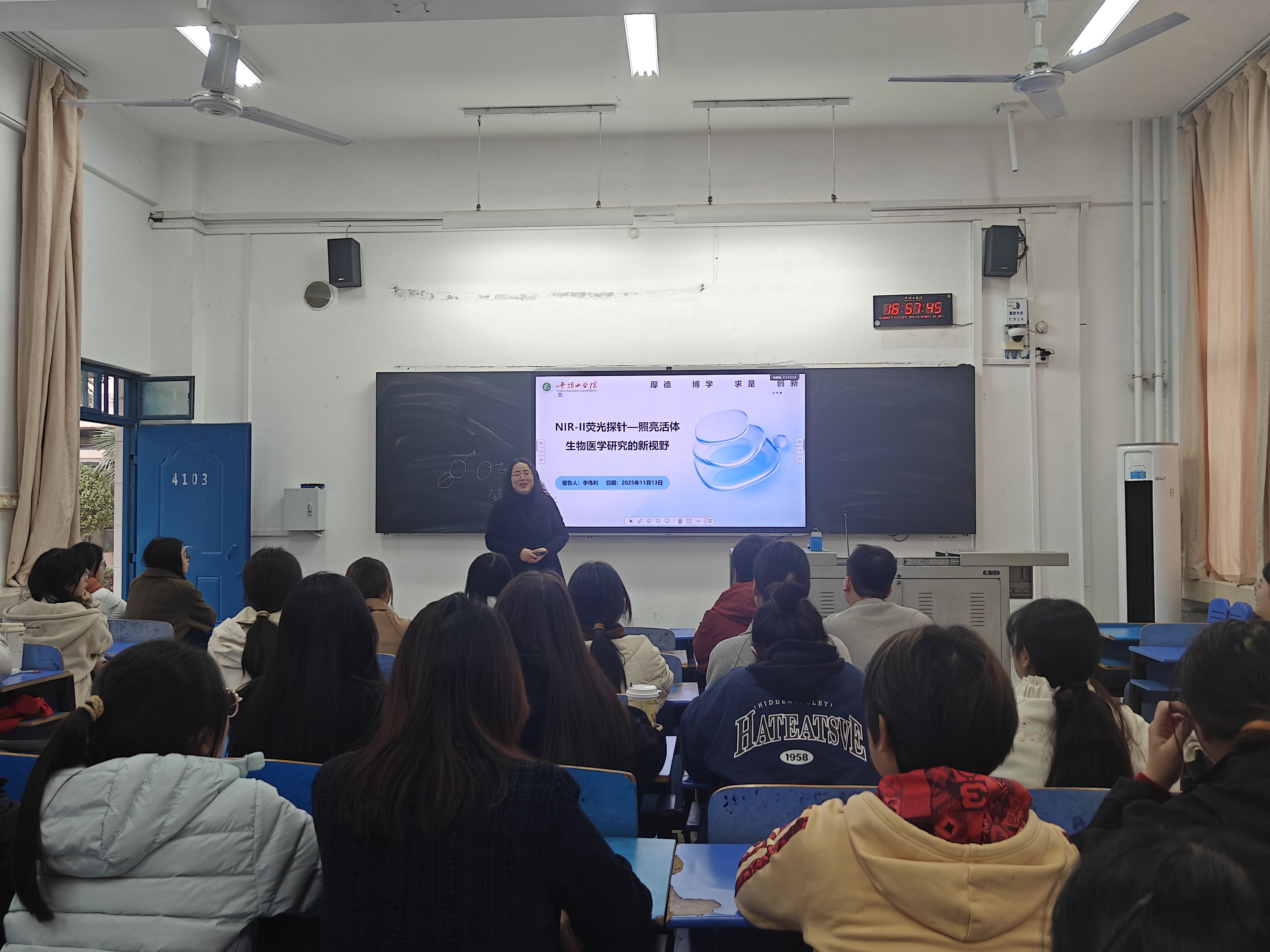 讲座围绕近红外二区(NIR-II)荧光成像技术展开,李伟利博士系统介绍了该技术在活体生物医学研究中的前沿进展与应用潜力。她深入浅出地讲解了NIR-II荧光探针的设计原理、功能特性及其在深层组织成像、疾病动态监测等方面的重要价值,为同学们揭示了这一技术如何为生命科学研究提供更清晰、更精准的观测窗口。