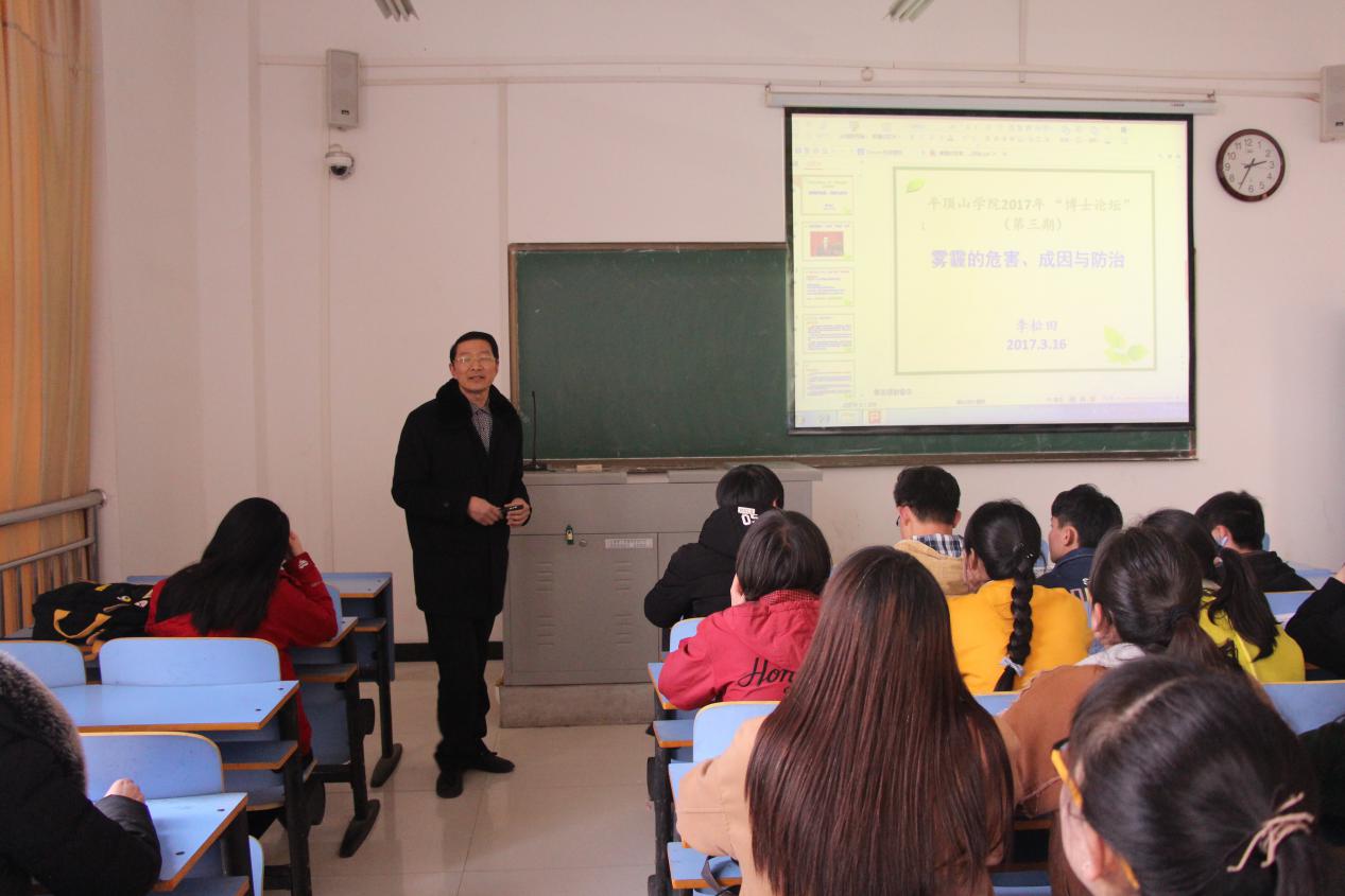 3月16日下午,李松田教授在我校博士论坛作了题为“雾霾的危害、成因和防治”学术报告,williamhill中文环境生态工程、化学专业学生听取了报告。