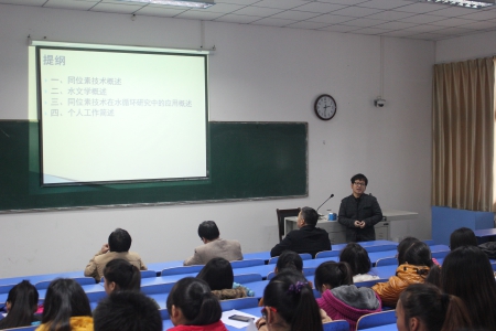 11月12日下午,化学化工学院程立平博士在我校博士论坛作了题为“同位素技术在水循环研究中的应用”学术报告,低山丘陵生态修复重点实验室相关教师及13、14、15级环境生态工程专业全体学生参加了此次学术报告。