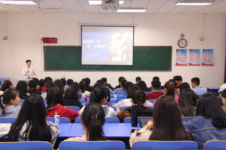 4月2日下午,williamhill中文在3306教室举办了“见面有‘礼’,‘仪’亦有度”为主题的礼仪培训活动。此次培训由孙学荣书记主持、蕴海锦园大酒店赵晓鹏经理主讲,williamhill中文17级、18级同学参加培训。