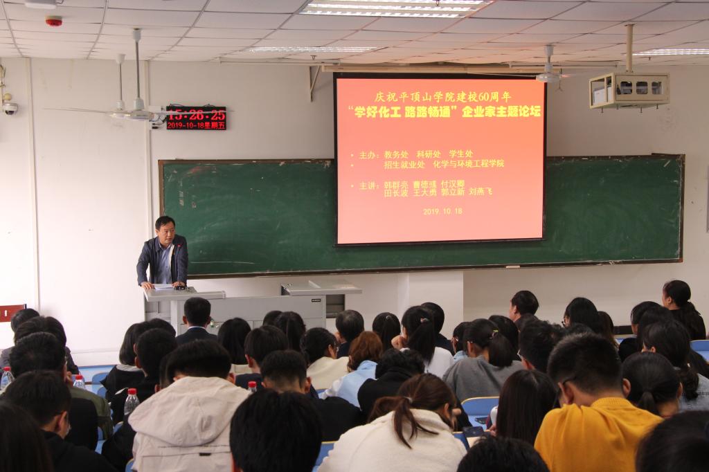 主题论坛上,五位校友分别以《中国平煤神马集团产业布局与发展前景》《方兴未艾的中国尼龙城建设》《转型升级中的煤化工产业》《中国岩盐之都盐化工产业发展概览》《化工人的心路历程》为题,为在场师生介绍了国内特别是平顶山周边地区尼龙化工、煤化工、盐化工产业结构现状及发展前景,分享了人生奋斗的感受及成功经验,使学生增进了专业认知,了解了就业前景,明确了学习方向。此外,宜昌半山酒店管理有限公司总经理、97级校友刘燕飞,中船重工710研究所高级工程师、97级校友郭立新也给同学们分享了他们不畏艰难、敢于打拼的生动故事,使同学们领略了他们永不退缩、勇攀新高的进取精神,增强了学好专业知识、书写精彩人生的信心和勇气。