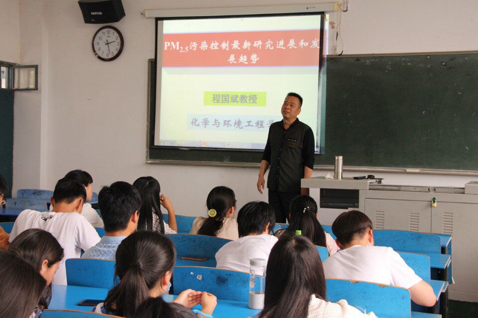 程国斌教授向同学们讲解了PM2.5污染对人体和环境的严重危害,使同学们了解到了PM2.5以及《环境空气质量标准》等方面的有关知识。接着,程教授围绕声波团聚技术、磁团聚与磁分离技术和电凝并技术等PM2.5控制技术方面展开了学术论述。他还向同学们讲述了PM2.5控制技术的发展方向与近期国外国内对PM2.5控制技术的研究热点。最后,程国斌教授热情地与同学们进行交流讲解,现场气氛异常热烈。