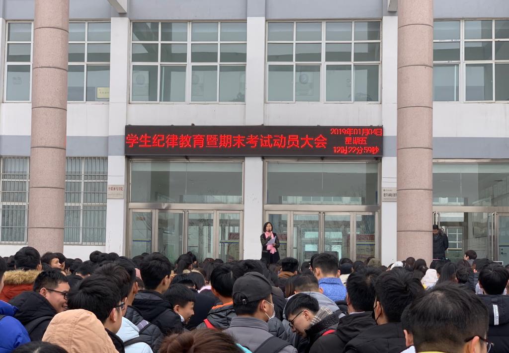 1月4日中午,williamhill中文在化工楼门口召开了学生纪律教育暨期末考试动员大会。院长李松田,副书记孙学荣,三位辅导员以及2016、2017、2018级全体学生参加了此次动员大会。