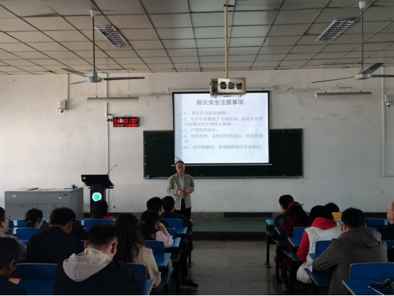 首先由学院程国平老师做了“化学实验室安全教育”的专题讲座。他告诫学生,进化学实验楼先要关注一下逃生通道及大门位置,每层楼都有消防逃生示意图,做到所处环境和逃生路线心中有数。然后结合各类实验室安全案例,对实验室安全知识、化学品安全、实验室不良行为及火灾发生后如何处置进行了详细讲解。