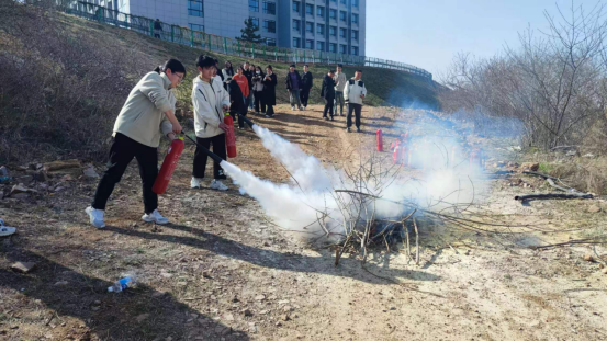 最后,师生们在室外空旷场地进行了灭火消防实战演习。面对现场燃烧的熊熊火焰,同学们沉着冷静,迅速拿起灭火器,结合学习的操作要领进行灭火,火势旺盛的柴堆被迅速扑灭。