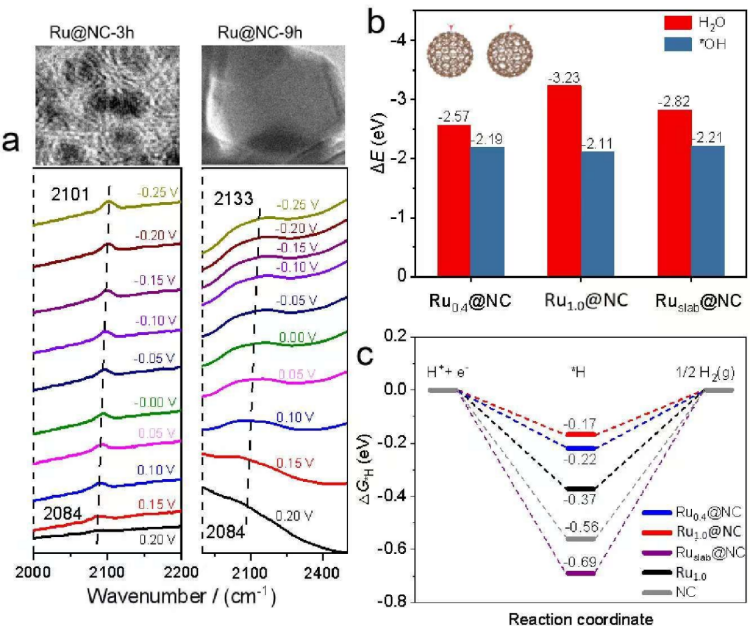 高性能电催化剂的设计与开发对于推动氢经济至关重要。催化剂电子结构和纳米尺寸对催化位点的内在活性起着关键作用。界面工程,特别是可控的核壳异质结构,已成为一种有前景的策略,仍面临重大挑战。本文中,我们开发了一系列Ru@NC异质结构,其中尺寸可控的Ru核心被掺氮石墨烯层包裹。Ru@NC-3h具有最佳的催化性能,具备优异的耐久性,质量活性是Pt/C的7.03倍。这归因于开放的多孔结构,增强了活性位点的暴露和质量传输,以及通过较小Ru核与掺氮薄壳之间的强异质界面相互作用优化了反应中间体的吸附和脱附,为高效Ru-based催化剂提共了新的研究思路。