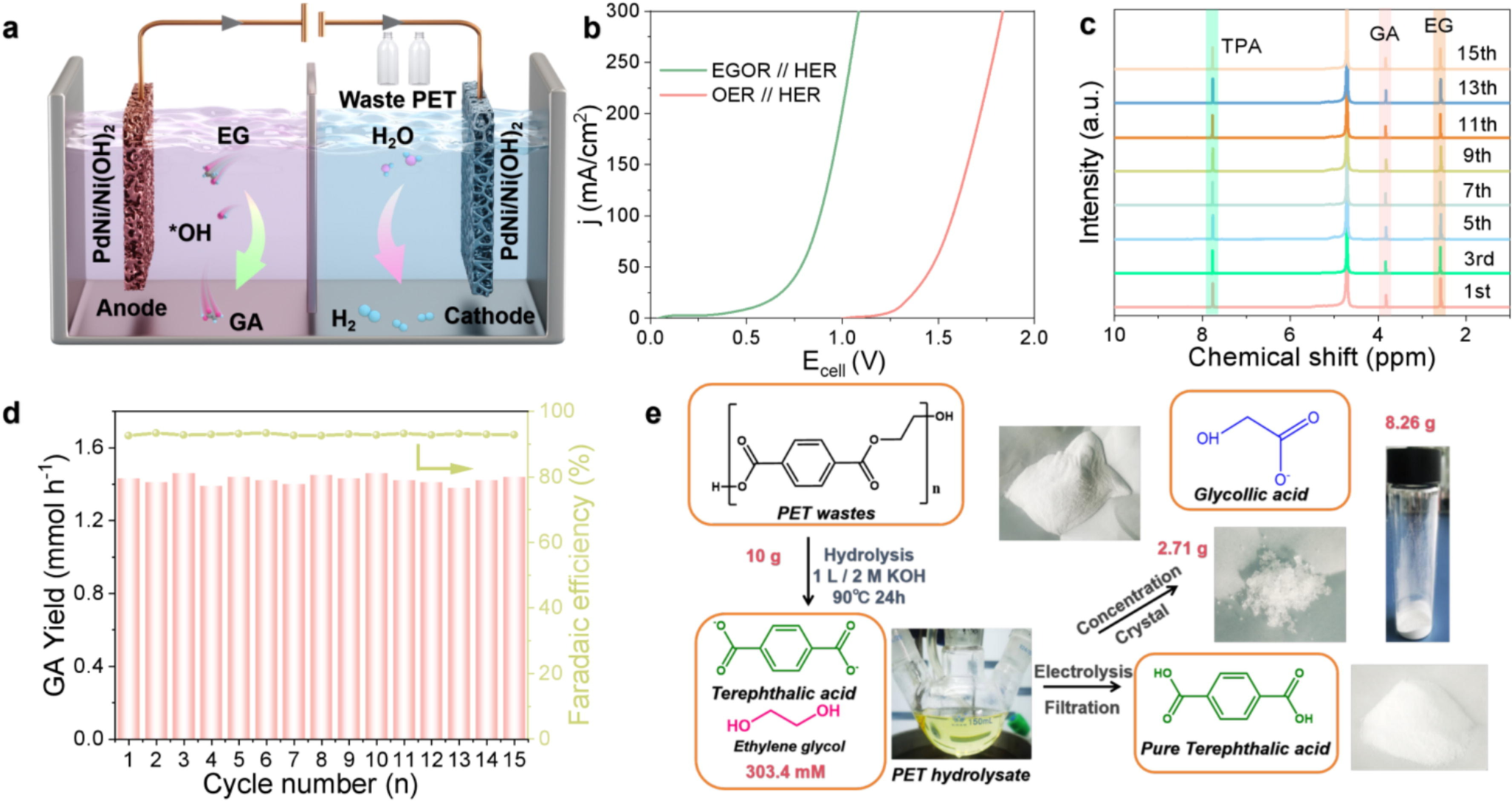 全球 PET 塑料污染日趋严重,传统机械回收与化学回收存在效率低、二次污染等难题。本研究以PET水解产物乙二醇为原料,通过合金介导关键中间体优化策略,实现废弃塑料向高附加值精细化学品的定向转化,为低碳塑料循环提供全新方案。团队采用水热合成与电沉积两步法,将PdNi合金纳米颗粒负载于Ni (OH)2纳米片,构筑高效催化界面。该体系显著提升抗CO毒化能力与循环稳定性,界面电子重构加速电荷转移,塔菲尔斜率低至98.9 mV dec⁻¹;通过强化*OH吸附、精准调控中间体转化,实现乙醇酸高选择性生成,副产物极少。在 1.0 V(vs RHE)条件下,乙醇酸产率达1.67 mmol h-1 cm-2。采用EG氧化替代传统析氧反应,在50 mA cm-2电流密度下电位降低约900 mV,大幅降低能耗。团队构建的阳极产乙醇酸、阴极联产氢气耦合体系,连续运行15次循环后效率仍保持92.9%以上,兼具高选择性、低能耗、长寿命等优势。