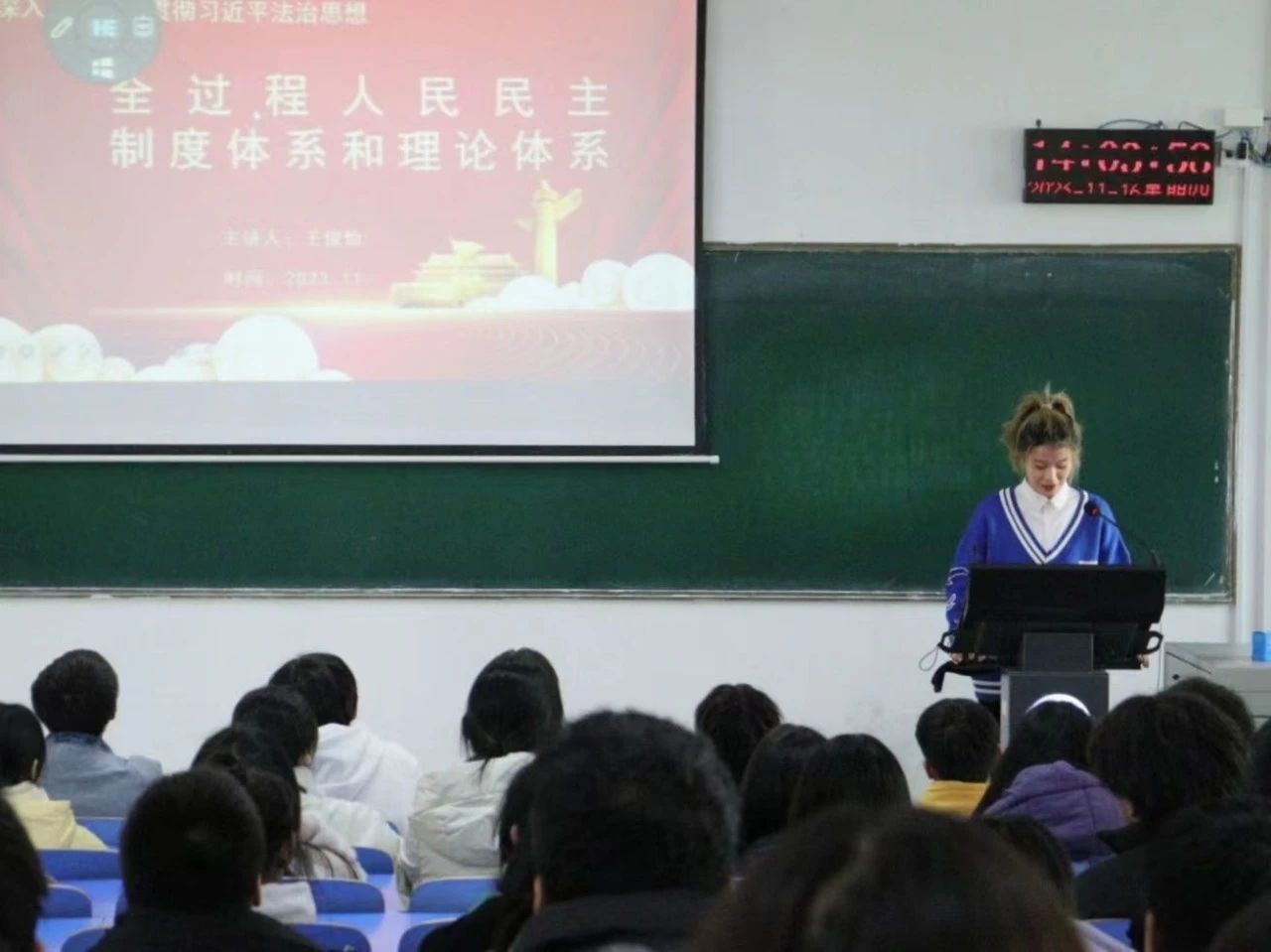 为深入学习贯彻习近平法治思想,加强大学生普法教育的针对性、时效性,积极引导学生遵法、学法、守法,williamhill中文于2023年11月16日下午在3207开展《全过程人民民主制度体系和理论体系》为题的法治宣讲教育,此次宣讲活动由政法学院法学专业2021级学生王俊怡主讲,2022级、2023级同学以及党团学社各部门负责人参加本次活动。